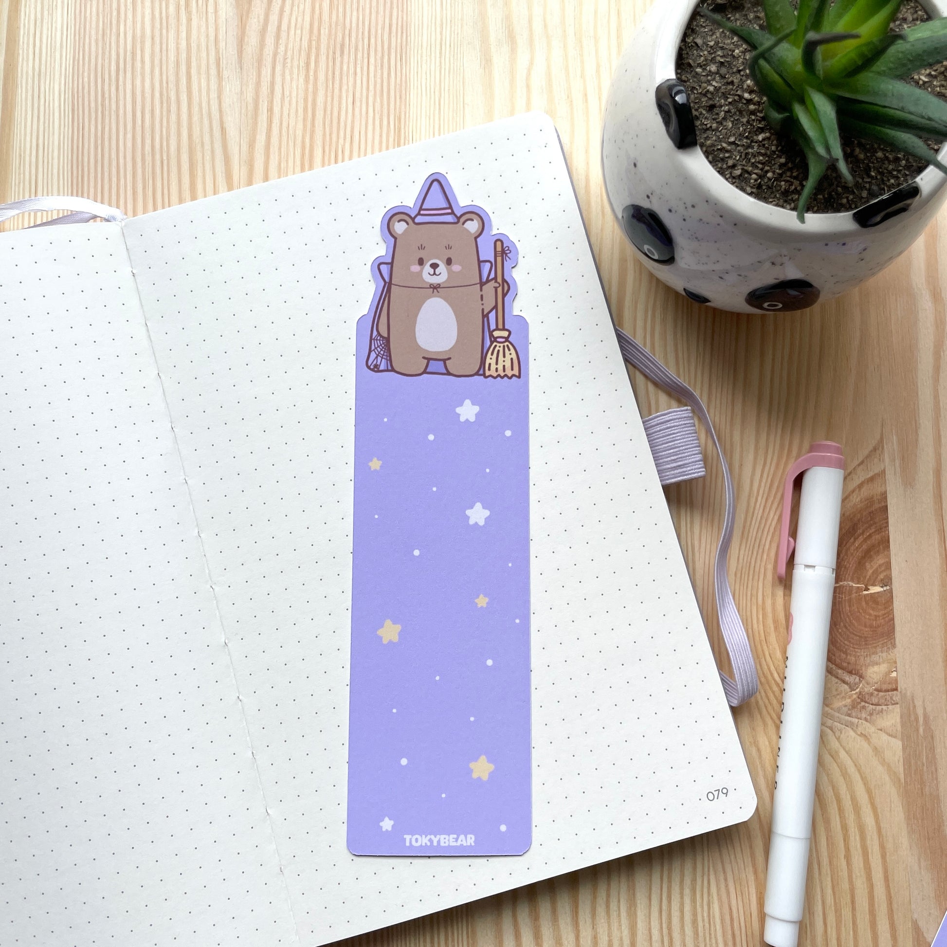 This playful bookmark features a charming bear holding a broom, perfect for adding a touch of magic to your reading adventures.