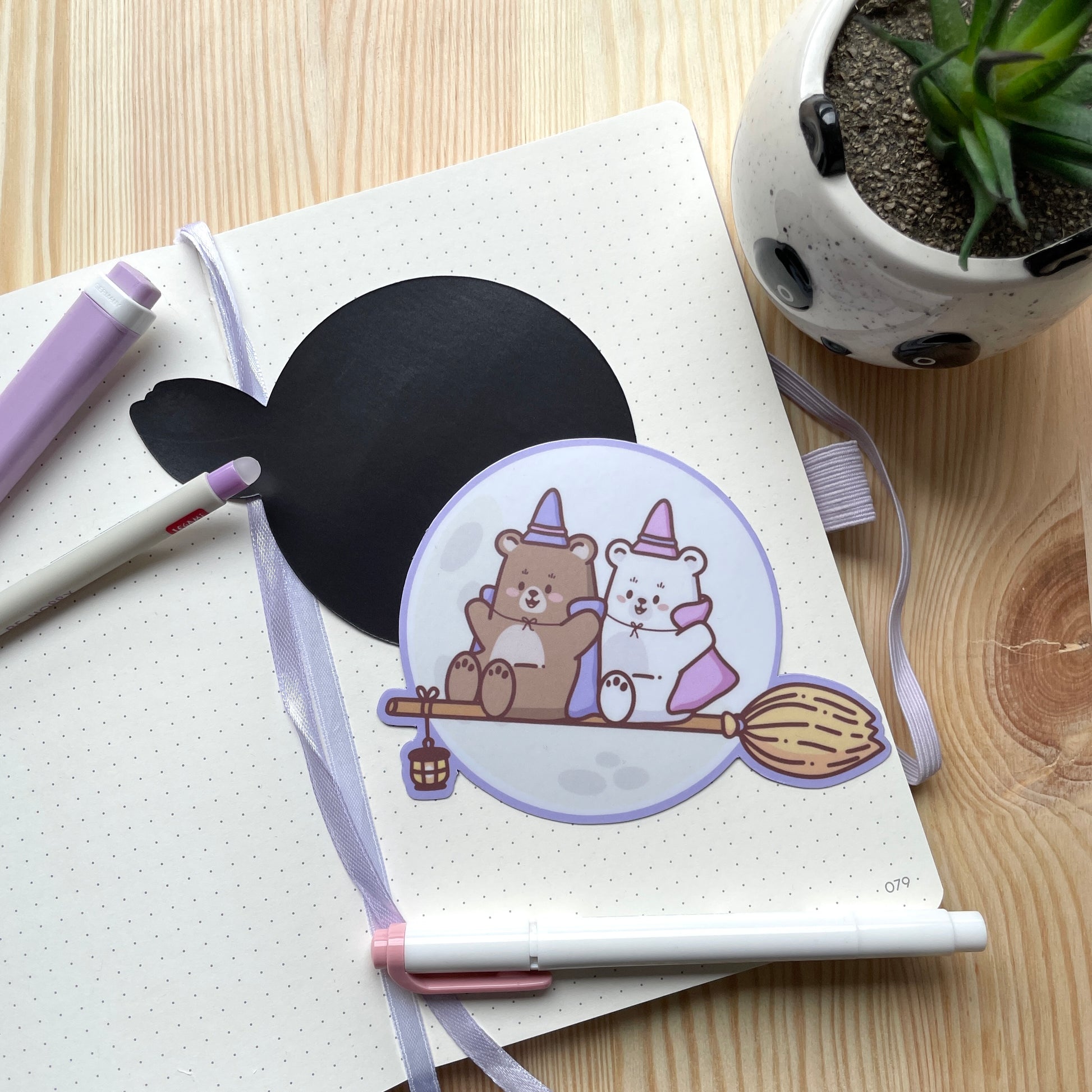 Add a touch of whimsy to your space with this playful magnet featuring two charming bears soaring on a broomstick beneath a glowing full moon. Perfect for decorating your fridge or freezer.